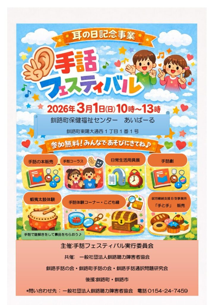 釧路聴力障害者協会、釧路手話の会、釧路町手話の会、釧路手話通訳問題研究会の4団体が実行委員会となって、耳の日記念事業として毎年開催している手話フェスティバル。今年は、3月1日(日)10時〜13時に、釧路町保健福祉センターあいぱーるで開催します。手話劇、手話コーラス、手話体験・謎解きゲーム、蝦夷太鼓体験などの他、手話の本や就労継続支援B型事業所「手と手」の販売コーナーなど、多彩なお祭りスタイルで賑やかな1日を過ごせます。ぜひ、ご家族やご友人、お知り合いの方を誘って、気軽にいらしてください。