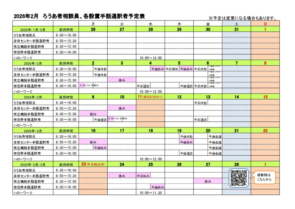 釧路市ろうあ者相談員・設置手話通訳者予定表