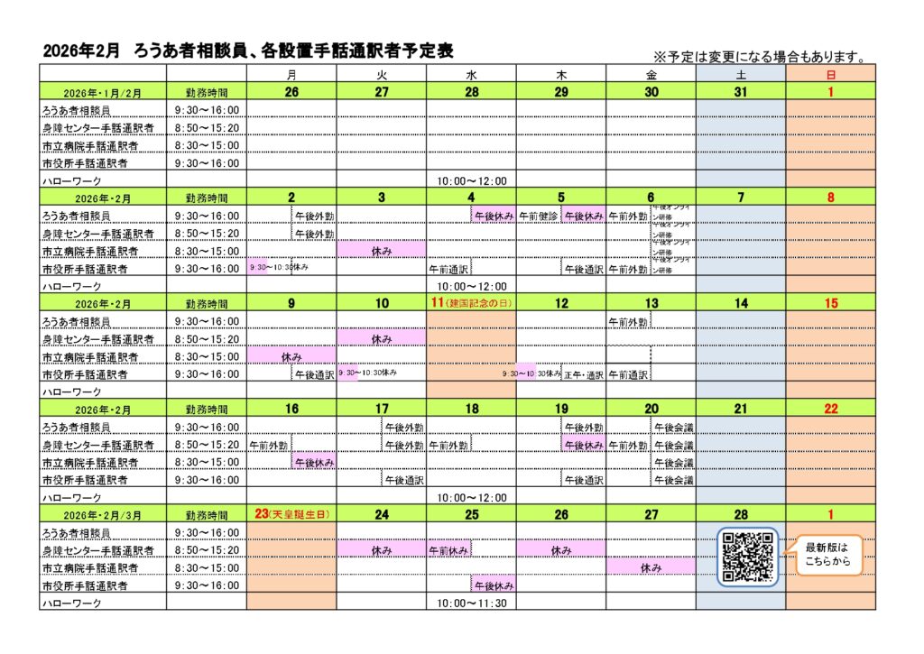 釧路市ろうあ者相談員・設置手話通訳者予定表